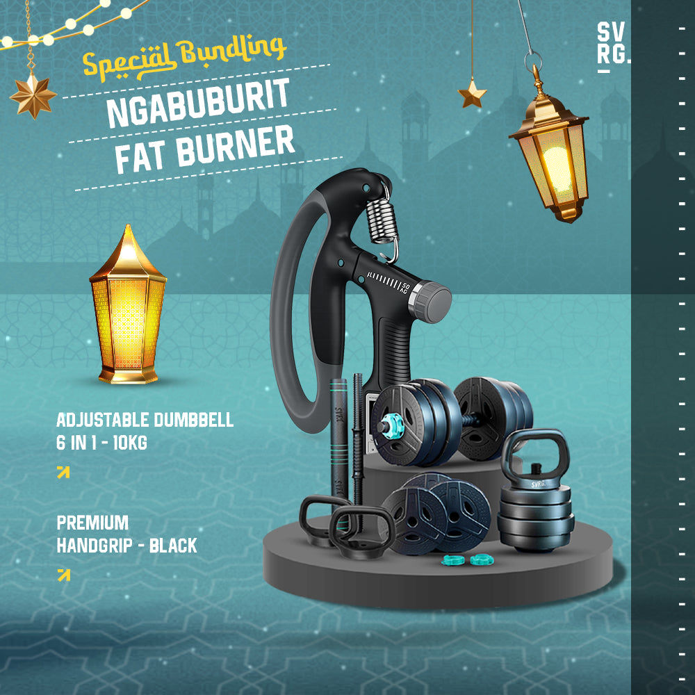 Bundling ini menggabungkan Adjustable Dumbbell 6 in 1 – 10kg dan Handgrip Trainer, sehingga latihan bisa lebih variatif untuk pembakaran kalori sekaligus penguatan otot lengan, dada, bahu, dan genggaman tangan. Ideal untuk home workout yang efisien, fleksibel, dan tetap konsisten selama Ramadhan.
