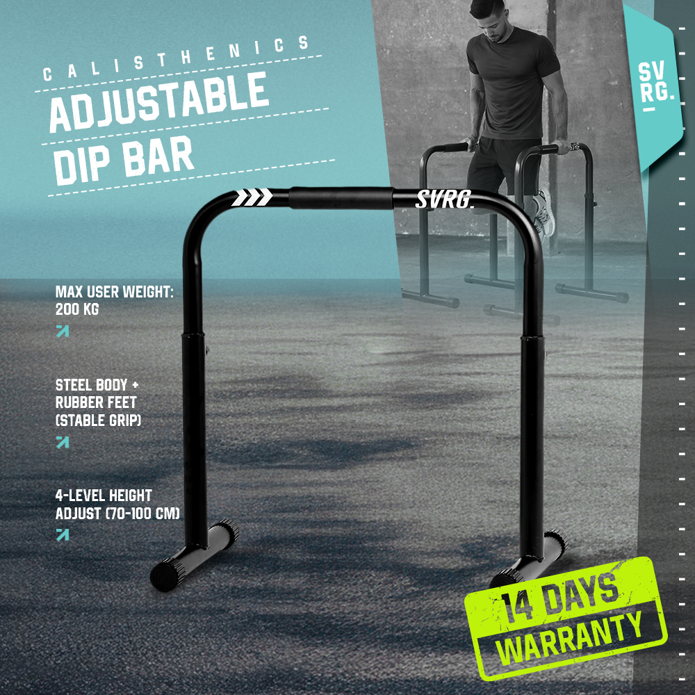 Adjustable Dip Bar adalah peralatan olahraga yang dirancang untuk membantu Anda membangun kekuatan tubuh bagian atas saat Anda berlatih di rumah. Alat olahraga ini baik digunakan untuk latihan Calisthenic, Dipping, dan Crossfit. Dip Bar ini juga dapat digunakan untuk melatih tubuh bagian atas dengan gerakan dips, inverted rows, dan inclined press-ups. Dip Bar memiliki fitur yang dapat disesuaikan, memungkinkan pengguna untuk mengatur ketinggian sesuai dengan kebutuhan dan tingkat kebugaran mereka. Terbuat dari bahan berkualitas tinggi, Dip Bar ini menawarkan kestabilan dan kekuatan yang optimal, sehingga aman digunakan untuk berbagai jenis latihan.