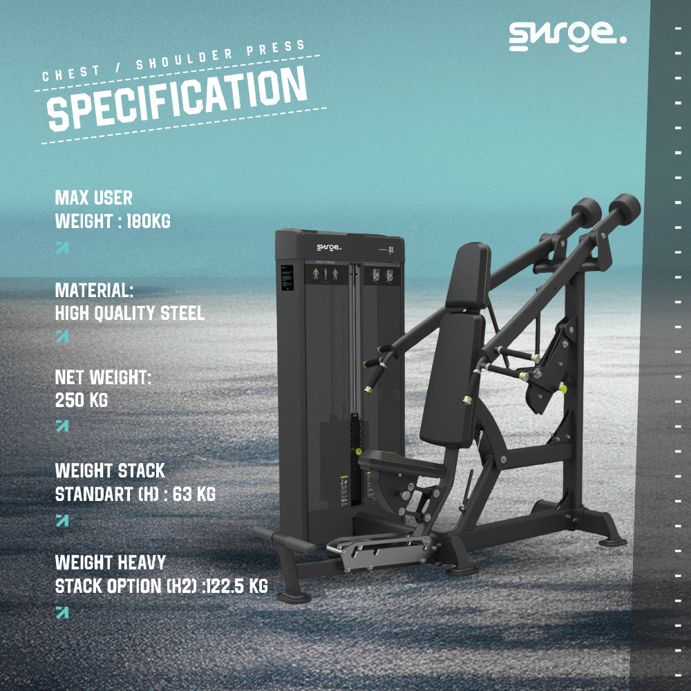 SURGE Commercial Chest Press / Shoulder Press – Strength Machine adalah mesin latihan profesional 2-in-1 yang dirancang untuk melatih otot dada, bahu, serta lengan atas secara efektif. Mesin ini menggabungkan dua fungsi utama—chest press dan shoulder press—dengan mekanisme ayunan yang halus dan stabil, menjadikannya alat yang efisien untuk gym komersial maupun home gym premium.