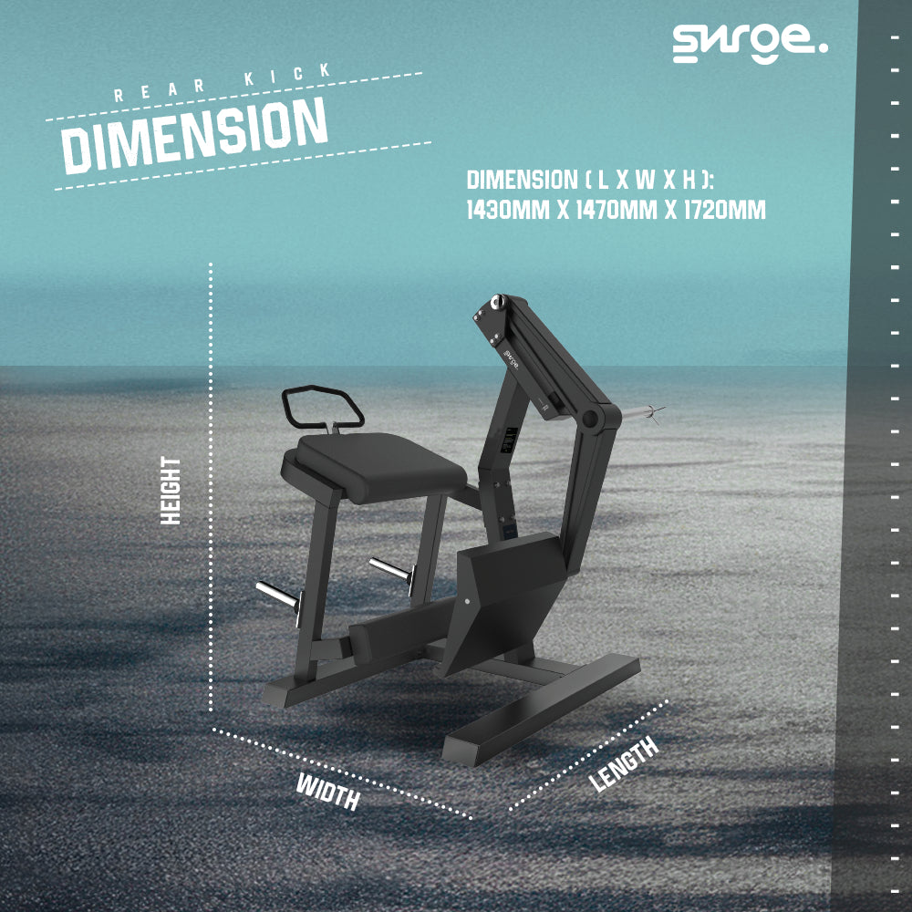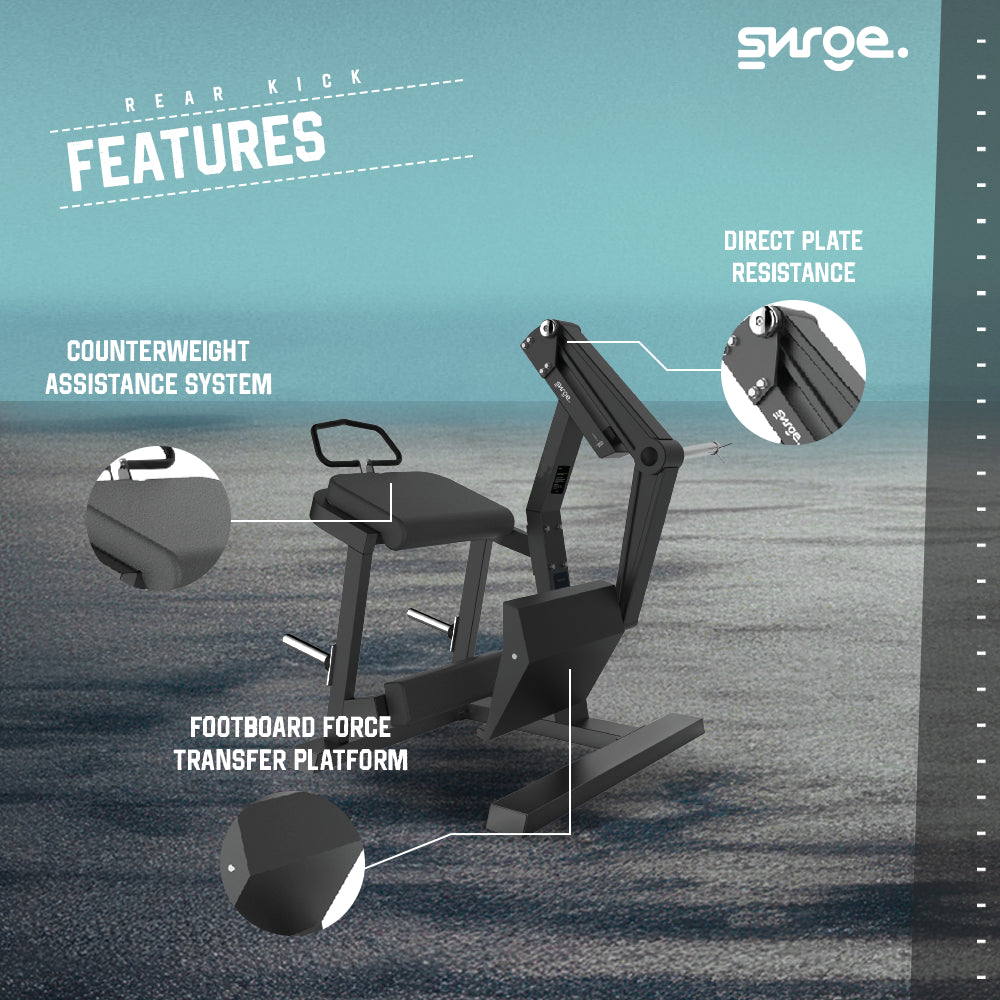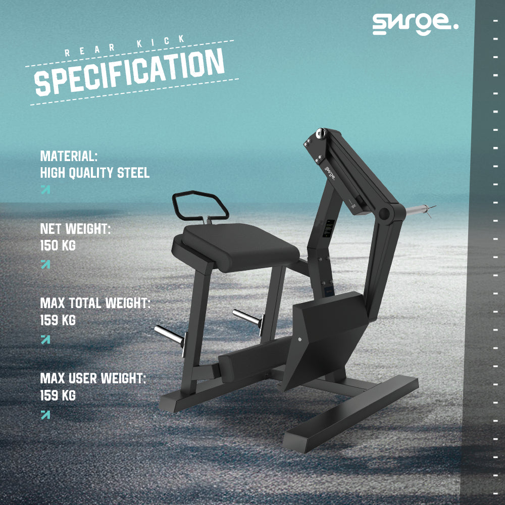 SURGE Commercial Rear Kick – Strength Machine adalah mesin latihan beban profesional tipe plate-loaded yang dirancang secara khusus untuk mengisolasi dan melatih otot bokong (Gluteus) serta otot paha belakang (Hamstrings). Mengadopsi lini "POWER LIFE", mesin ini menawarkan gerakan yang presisi dan stabil untuk pembentukan otot tubuh bagian bawah, menjadikannya pilihan utama bagi gym komersial maupun fasilitas kebugaran intensitas tinggi.
