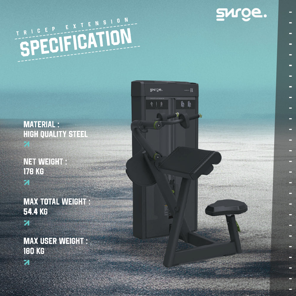 SURGE Commercial Triceps Extension adalah mesin latihan profesional yang dirancang khusus untuk mengisolasi dan menguatkan otot triceps dengan gerakan yang stabil, aman, serta ergonomis. Dengan konstruksi commercial grade dan sistem pergerakan yang halus, alat ini cocok untuk digunakan pada gym komersial maupun home gym premium.